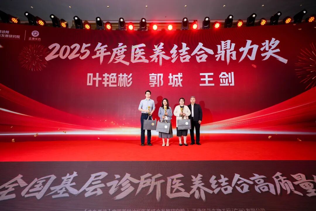 "2025年度医养结合鼎力支持奖",由衷感谢他们为医养事业提供的强大技术资源支持,他们的贡献让我们深刻体会到:携手共进,方能成就伟业。他们是:暨南大学附属第一医院临床营养科主任医师叶艳彬教授、中山大学公共卫生学院郭城教授、上海交大生科院硕士,厢健不晚品牌创始人王剑女士,由正康华药总裁阙和旭先生颁奖。